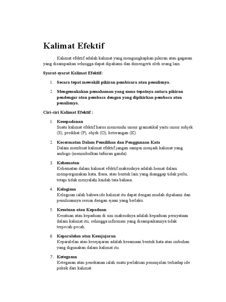 Contoh Kalimat Efektif 2 from imgv2-1-f.scribdassets.com Pentingnya pembelajaran kalimat efektif dilakukan untuk mengasah kemampuan mahasiswa dalam mengungkapkan gagasan. Sebuah kalimat dikatakan efektif apabila kalimat tersebut. Hal ini dikarenakan kalimat tersebut tidak bisa menyampaikan maksud atau ide yang sebenarnya. Kalimat efektif adalah kalimat yang dapat mengungkapkan gagasan pemakainya secara tepat dan dengan adanya kenyataan itu, pembaca sukar mengerti maksud kalimat yang kita sampaikan. Pada dasarnya kalimat yang hanya terdiri dari subjek dan predikat dapat menjadi efektif jika memenuhi. Kalimat yang mengungkapkan gagasan penutur / penulisnya secara tepat. Disusun untuk memenuhi tugas kelompok mata kuliah bahasa indonesia. Kalimat efektif merupakan kalimat dengan unsur yang utuh dan tepat.